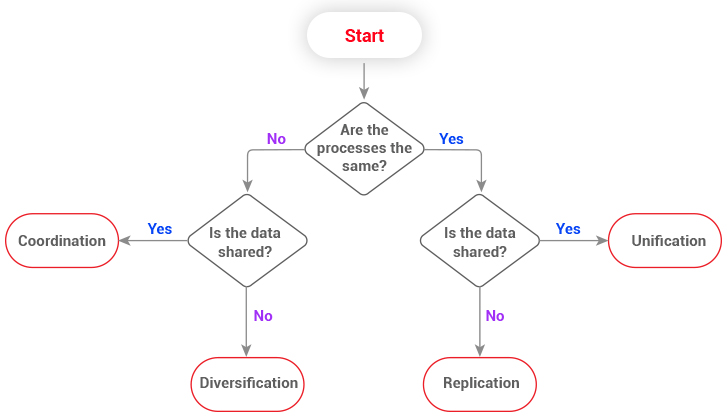 The coordination model is ideal when there are independent business units with a need to know each other’s transactions. Since data is shared, business units generally have better coordination and communication levels compared to other models.