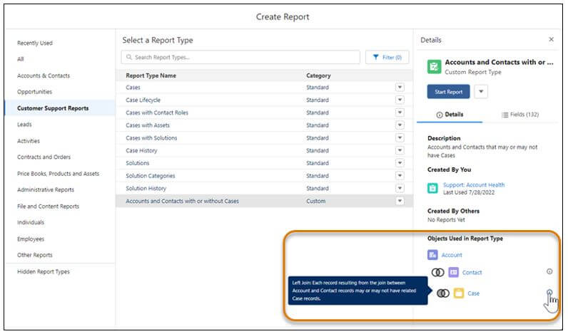 First up is the ability to now see the relationships in a Custom Report Type when taking the steps to create a new Report, allowing you to select the best one to meet your needs. To do this, you just need to start the process to create a new Report and when it prompts you to select a Report Type, you click on a custom one and the details show, as in the screenshot below. It will give you the details for which objects are included and will also explain the nature of the join - whether the related object may or may not have records, for example.