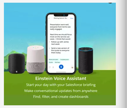 Einstein Voice enables all users to talk to Salesforce from any device. With Einstein Voice Assistant and Einstein Voice Bots, it can support both your customers and team.