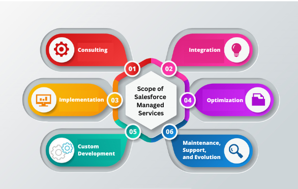 Consulting services include the use of tailored strategies to meet the business objectives of sales, marketing, customer service, and other functions. Salesforce Managed Service Providers can help you with advisory and roadmap building for customization, development, deployment challenges, upgrades, migrations, and maintenance, so you can improve business efficiency and ROI with Salesforce.