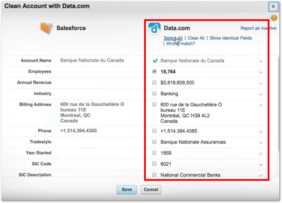 Data.com is a paid service that can be used to “clean” data including leads, accounts and contacts by looking up your records in a Dun & Bradstreet database and suggesting additional data or updates that should be applied to your existing records. Over 100 fields are available to enrich your data. You have control over how the updates are applied and can make them fully automated or have manual control over how updates are applied.