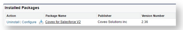 - In Salesforce, on the Installed Packages page, next to the Coveo for Salesforce V2 package, select Configure as shown in below screenshot.