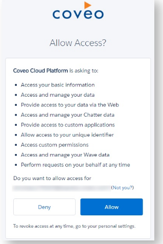 - In the Allow Access? window, allow the Coveo Cloud Platform access to your Salesforce organization