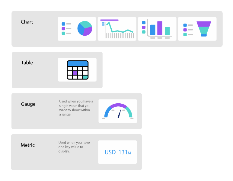 Once the Dashboard Builder is launched, you will be able to insert different types of components into your dashboard: