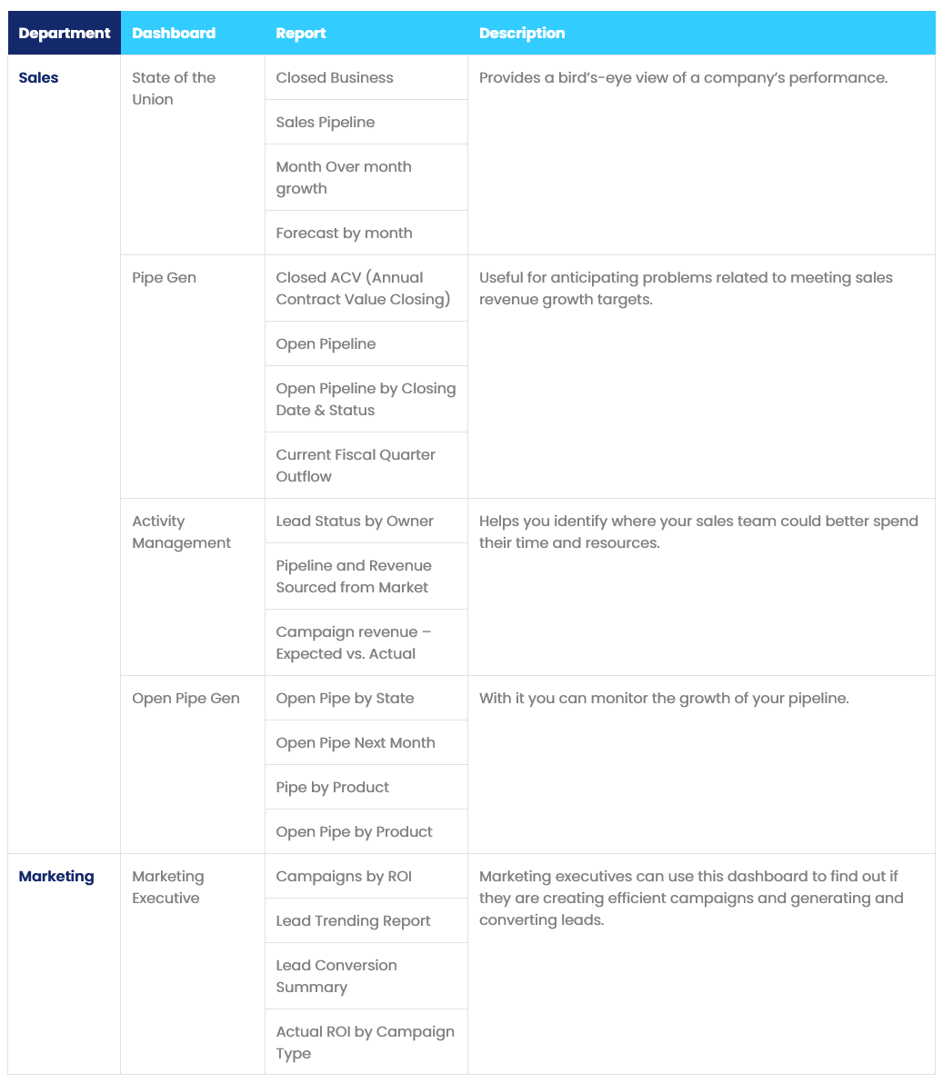 Salesforce makes your job easier by offering you a wide variety of standard dashboards, geared towards both sales & marketing and services. All of them are designed to increase efficiency and accelerate business productivity.