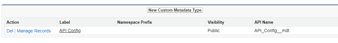 Give it a label, say “API Config” and save. It will be saved as API_Config__mdt.