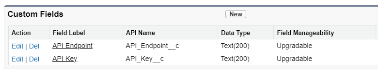 In our Custom Metadata Type, let’s add fields for our API key and endpoint URL. Let's call them "API_Key__c" and "API_Endpoint__c."