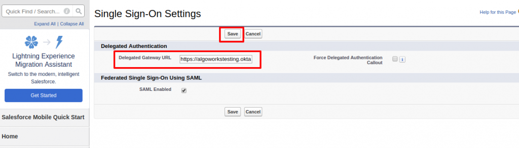 - Now go to Single Sign On settings in your org, and click Edit button. Paste the URL you have copied earlier in Delegated Gateway URL.