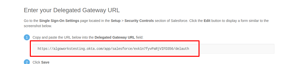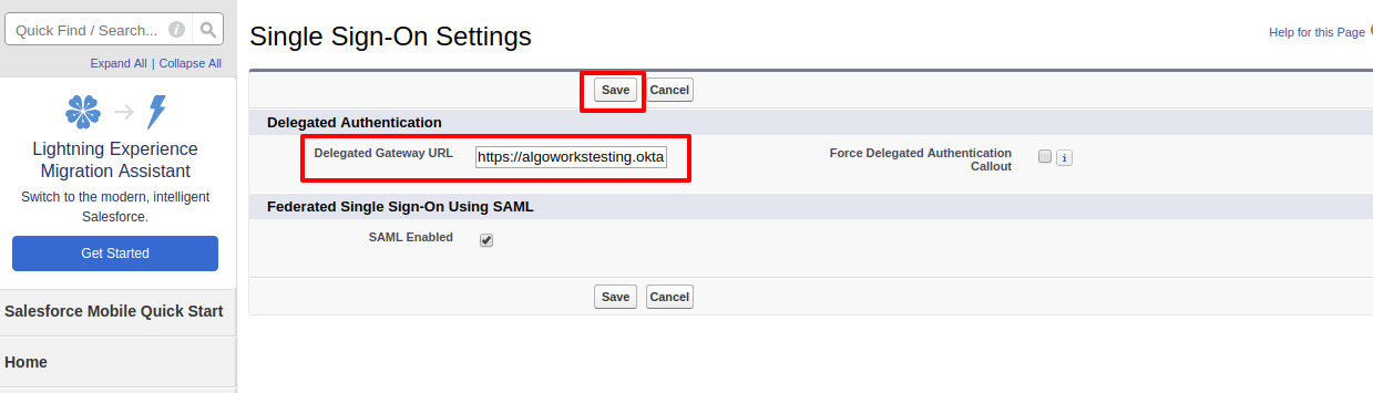 - Now go to Single Sign On settings in your org, and click Edit button. Paste the URL you have copied earlier in Delegated Gateway URL.
