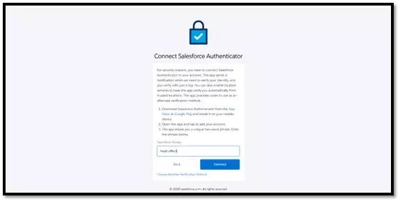 - After clicking on the login button, the “Connect Salesforce Authenticator” page will be opened. Enter the two-word phrase from the Salesforce Authenticator application and then click the “Connect” button.