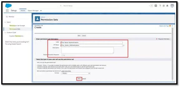 - Click the “New” button to create a new permission set for the user and enter the label name. The API name will automatically generate, then click the “Save” button.
