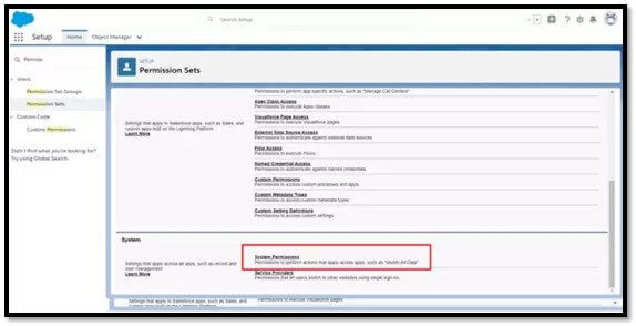 - After saving, scroll down and click “System Permissions” under the system section in the created permission set. Then click the “Edit” button.