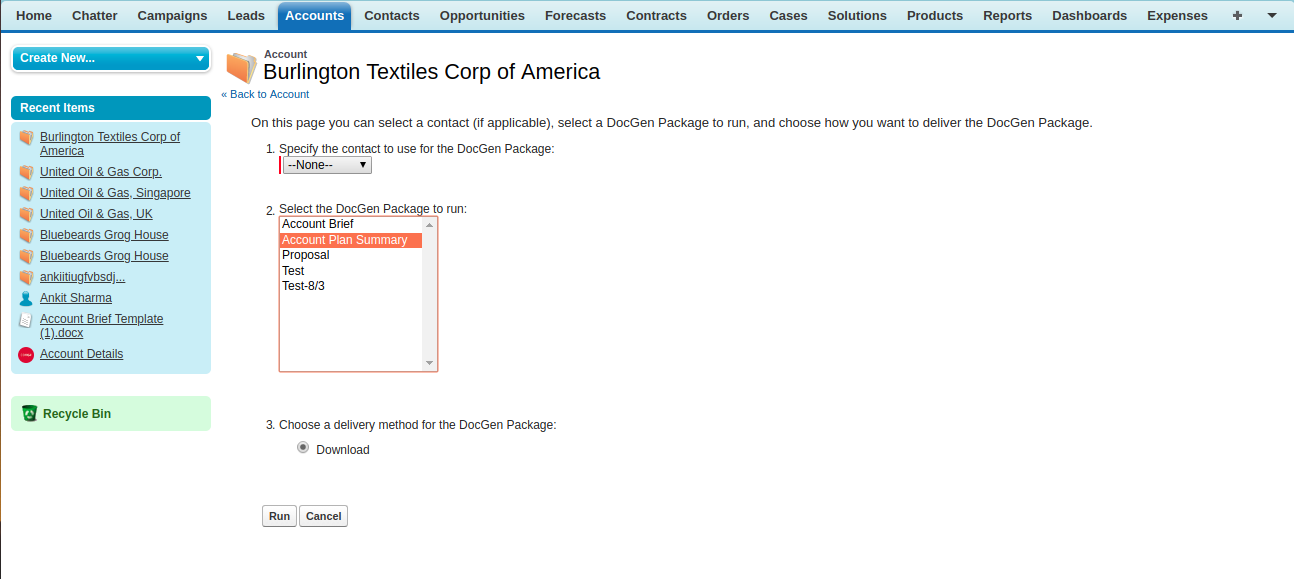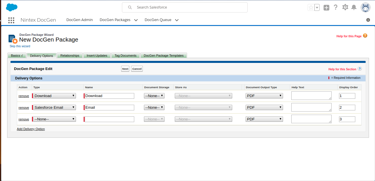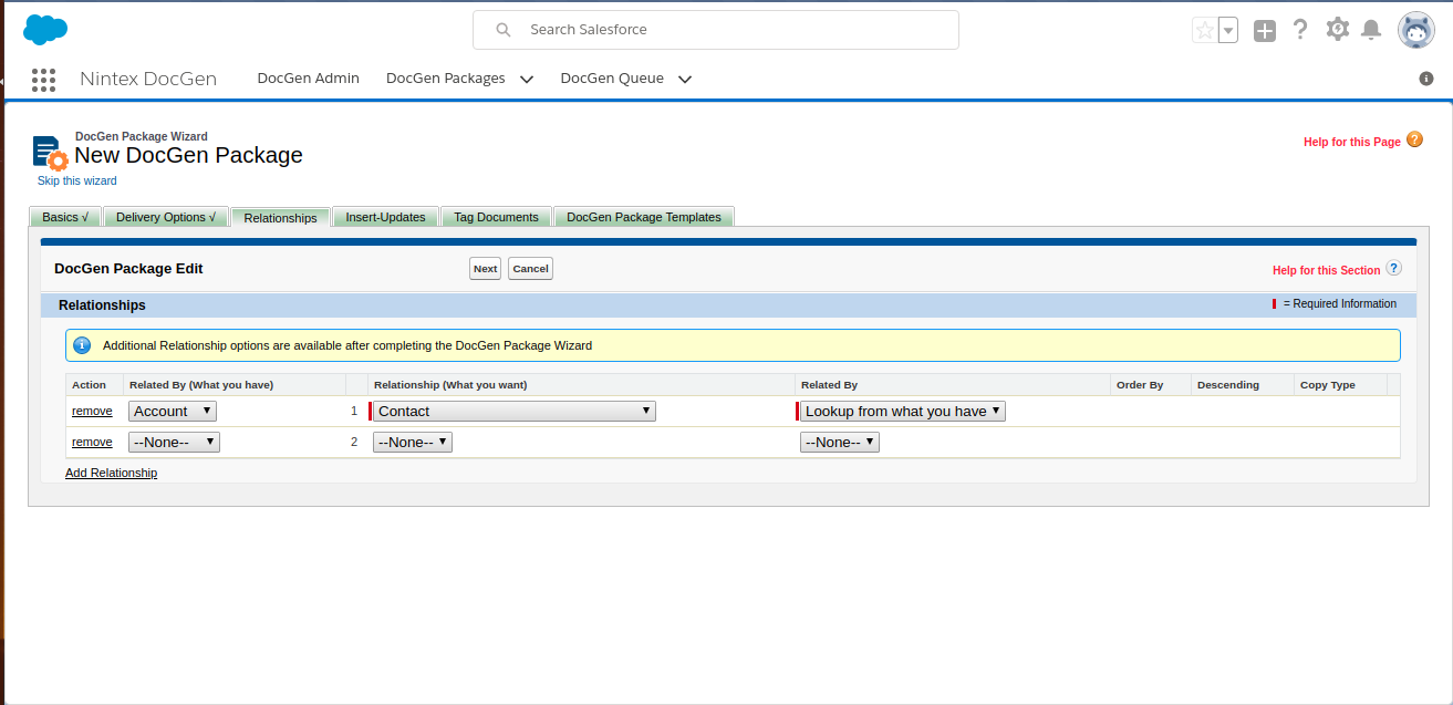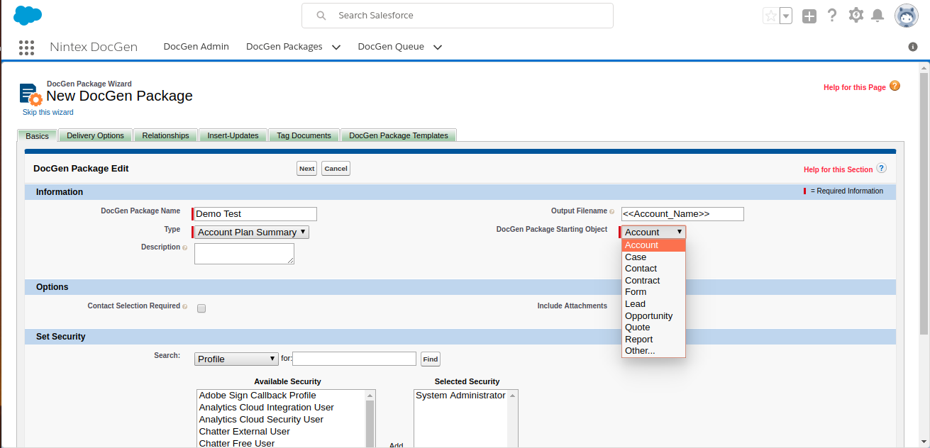 - In the basics, we need to name the package name, type of package and starting object on which we are going to generate documents, for a custom object we need to select other and then next drop-down choose our appropriate object. We can also set the security by profile and roles. If this done then click next.