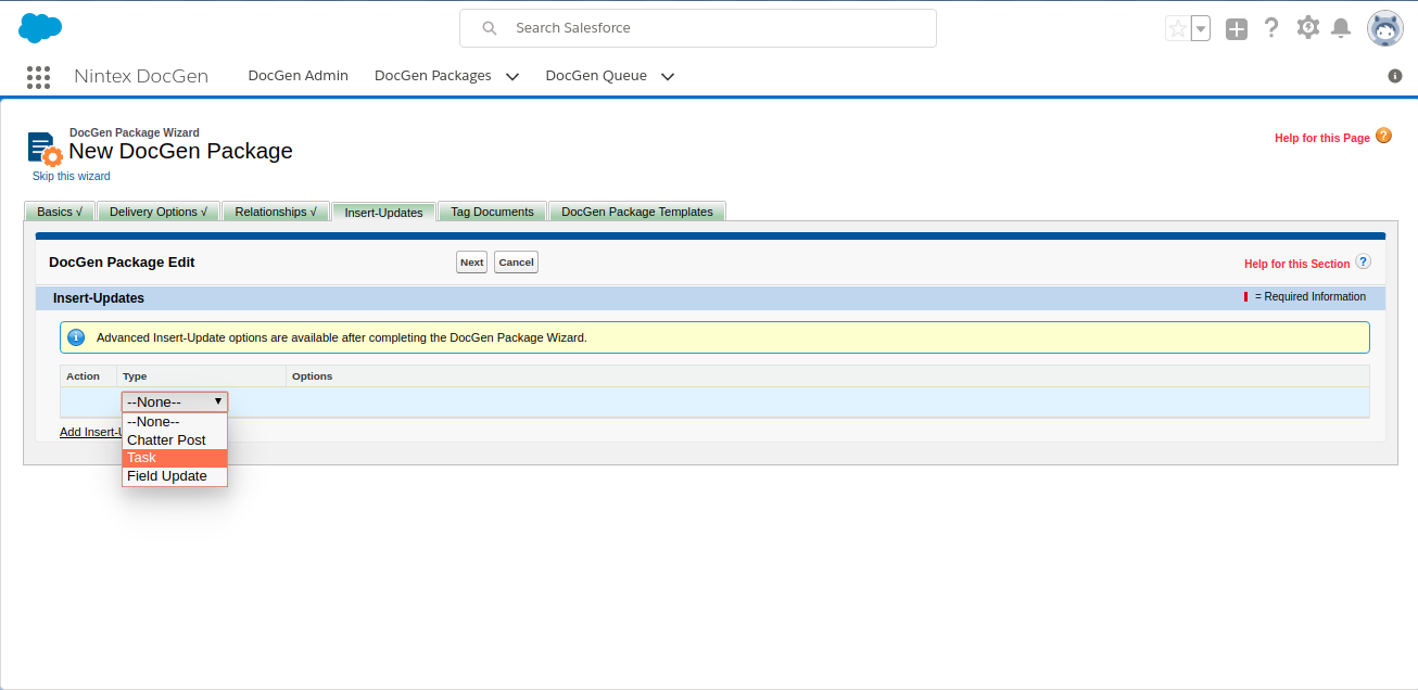 - Next, In insert-updates, we can choose what action need to perform after the generation of docs such as fields update, chatter post, and task.