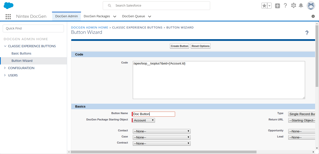 Start by creating a button for an object, after opening Nintex drawloop app, go to Docgen Admin tab and Button Wizard.