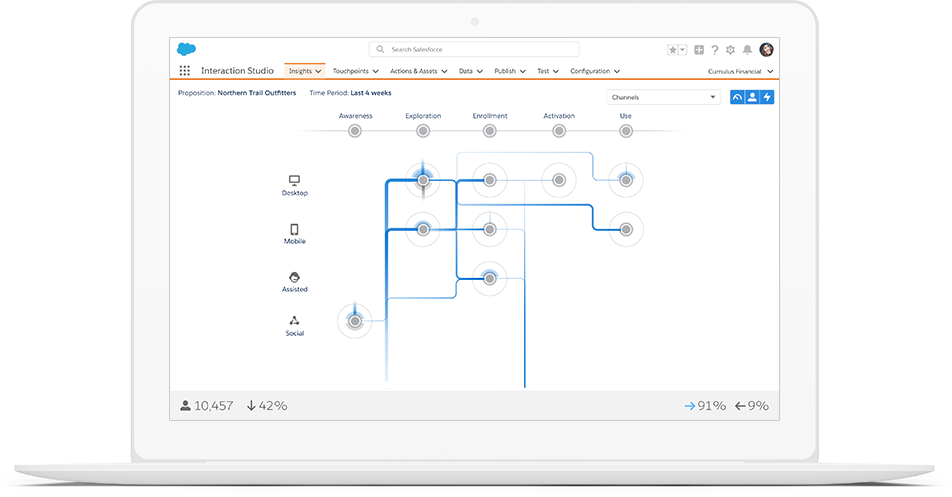 Salesforce Marketing Cloud Interaction Studio enables you to guide the customer in the correct path, by triggering interaction where they are and on the channels they prefer. It also ensures that your message is relevant and consistent across all the channels for a connected Customer Experience while also controlling and monitoring message saturation and fatigue. You can also synchronize online and offline interactions like Point of Sale, Online transactions or ATMs.