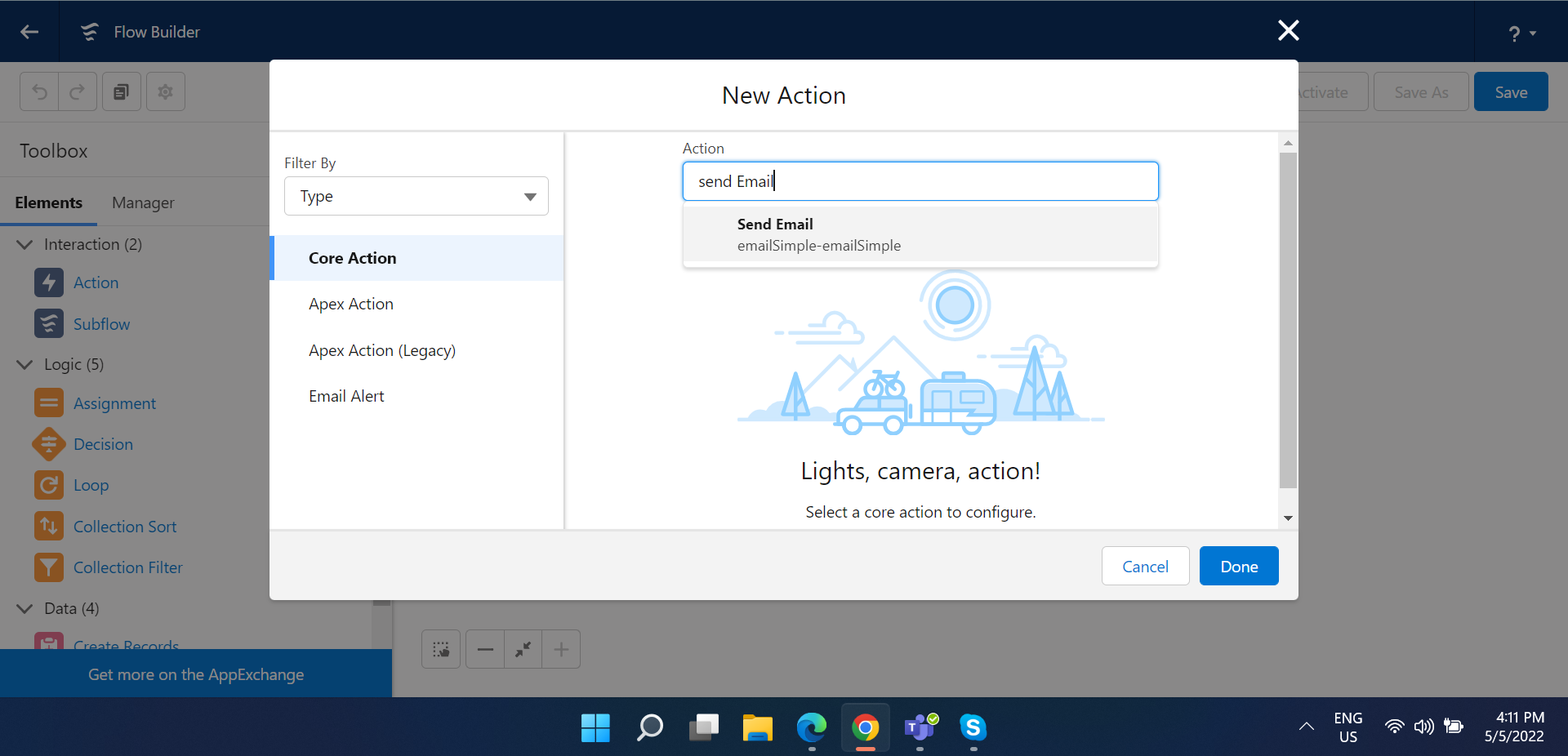 - In flow canvas select Action element.