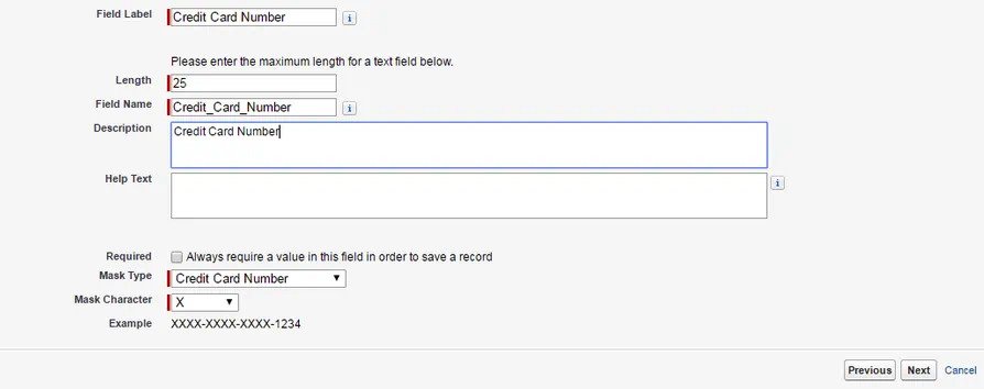 Encrypted text fields have the option of “masking” parts of sensitive information, for example, showing the last four digits of a credit card number while hiding the rest.