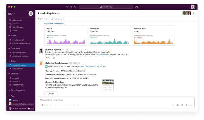 Marketing Cloud and Datorama's intelligent, AI-driven insights – such as lower-than-expected engagement – are delivered immediately in Slack, allowing teams to act quickly to keep campaigns on track.
