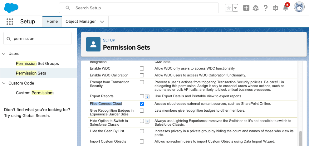 You’ll also have to give access to Files Connect to the users who will be making the connections, such as yourself. To give permission to users, you will have to enable Files Connect Cloud on their profile. You can also make a permission set if you want to give specific individuals access to Files Connect.