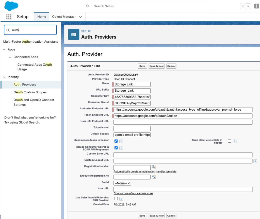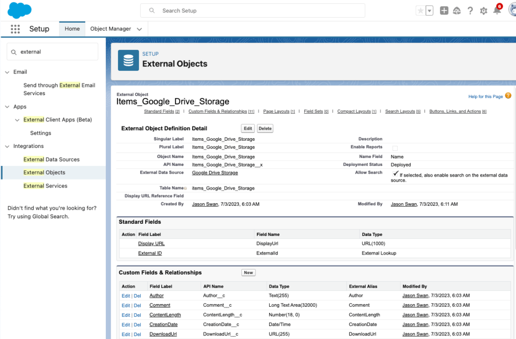 Now that you have made an authentication provider to a third-party source, you must also define an external data source rule so that salesforce knows how to access the data stored outside of your org. The settings of this external data source will depend on the type of external data source you are using. Yet again, Salesforce provides instructions on how to create new external data sources, such as with Google Drive. Be sure to use the authentication provider you made in the previous step, as this will give the external data source permission to access the external files.