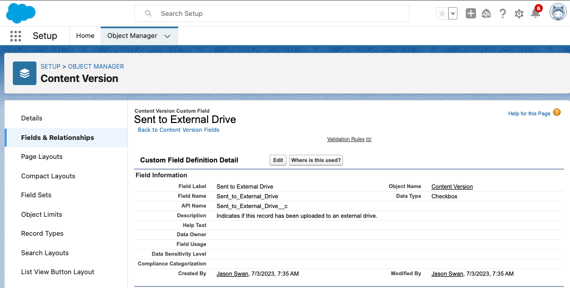 We need a way to detect when a file is uploaded to the external drive. To do that, add a new checkbox to the ContentVersion object, with a name like ‘Sent to External Drive,’ which will be used to track when a record is uploaded to the external drive. We also need to add a field that stores the Id of the external object on the ContentVersion. This will make it easier to build new connections to the external object.