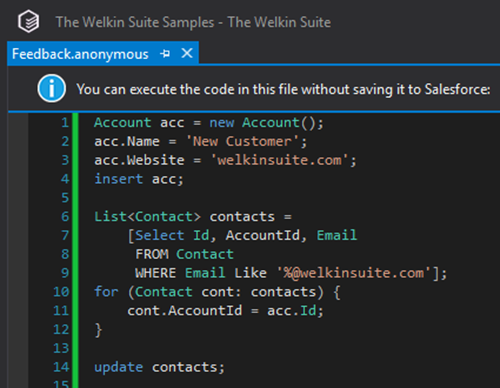For example, you've just written some business logic in Apex, like that shown above - it just creates new accounts, searches for contacts with an email at some domain, and links them together. Usually in .NET, you'd go directly to the database to see the changes, or output some info to the log file. Eventually, you would find a way to execute this small piece of logic without executing anything else - it will either be a console application, or it could be a unit test.