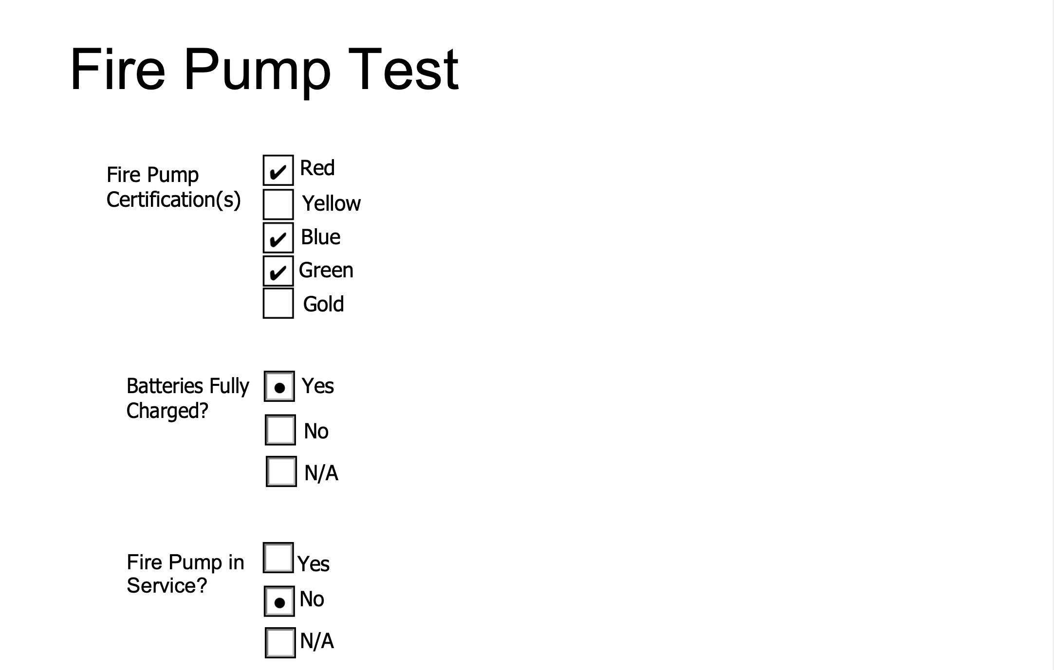 Before generating the PDF in Salesforce, you should consider creating pdf templates of the reports in a PDF editor of your choice. You will want to give each fillable field a unique enough name so that you can easily extract data from it later. An example of this would be the following: Fire_Pump_Asset_Inspection__c-Certifications__c-AssetId-Checkbox-Red.