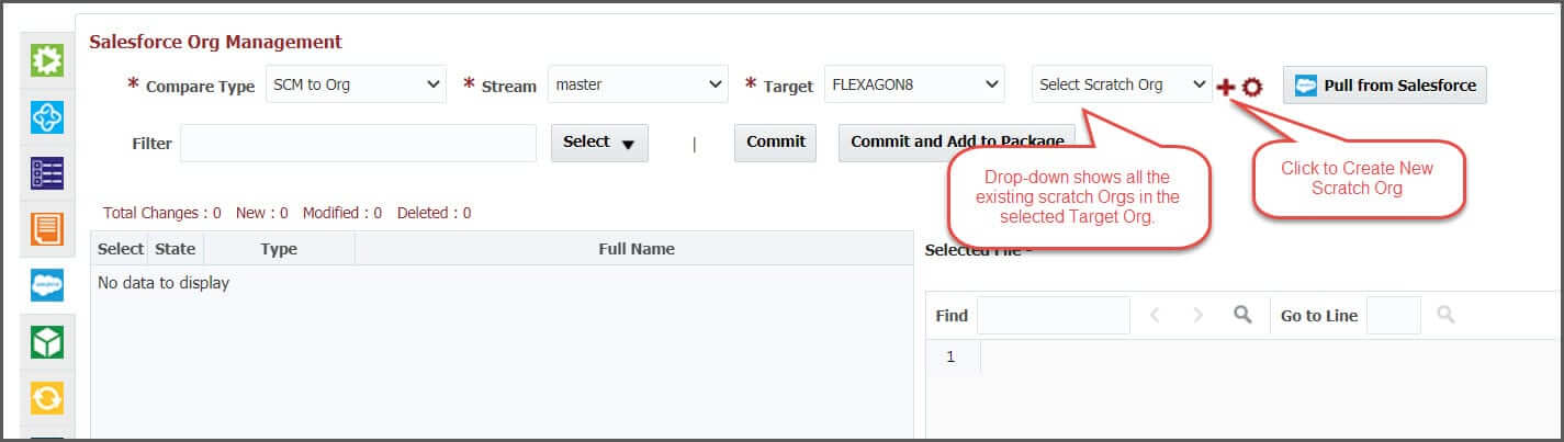 FlexDeploy’s Salesforce Org Management screen automatically brings up all the scratch org created if the Dev Hub org is selected. You can view and create your new scratch org by clicking on the + icon next to the “Select Scratch Org” drop-down.
