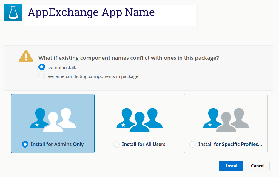 A. Here you can choose one of the three optionInstall for Admins Only - means the app is available for Admin profile user.Install for All Users - means the app is available for all users. Install for Specific Profiles - means this app is available for profiles with different access levels.