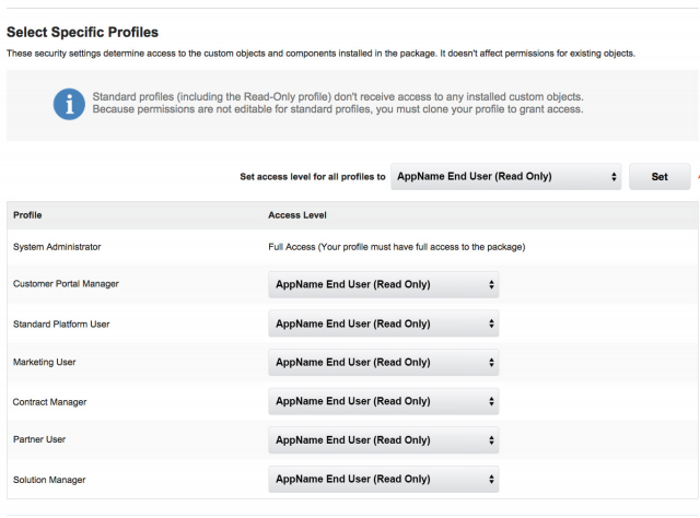 B. If you choose the third option to “Install for Specific Profiles” then In the picklist, select the “AppName End User (Read Only)” access level. Click the Set button to update all profiles at once.