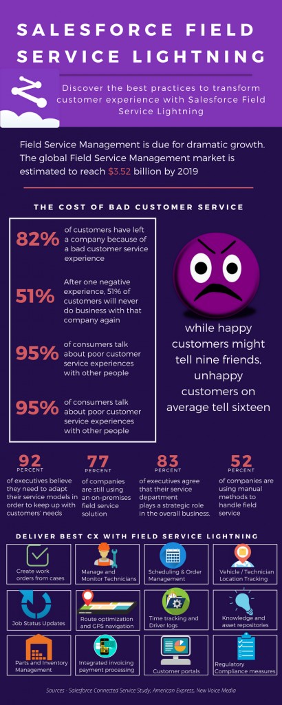 In the era of Digital Transformation, Customer Experience (CX) is the new battleground, and delivering superior CX has never been more important. In fact, according to the Customer 2020 report, Customer experience will overtake price and product as the key brand differentiator by 2020. Companies that deliver better brand experiences achieve higher customer satisfaction rates, reduced customer churn and increased revenues whereas poor customer service is more expensive than you can imagine. According to New Voice Media, $62 billion is lost by U.S companies alone each year due to poor customer service. Furthermore, the RightNow Customer Experience impact report reveals that a staggering 89% of consumers have stopped doing business with a company after experiencing poor customer service. Customer experience being the game-changer in today’s digital world, it is critical that businesses be equipped to deliver what customers expect, especially when it comes to Field Service Management. Read on to find out the top challenges of Field service management and how the Salesforce’s fastest growing product – Field Service Lightning helps deliver personalized, smarter, faster service that transforms customer experience like never before.