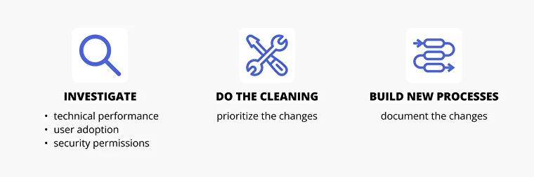 Once you have all the reports in place, start the cleaning. It's obvious that you won't be able to fix everything at once, so it's good practice to prioritize the changes in the order of importance, such as those that affect customer relationships, or things that block potential customizations, and security.