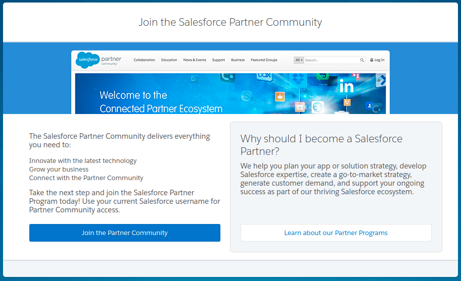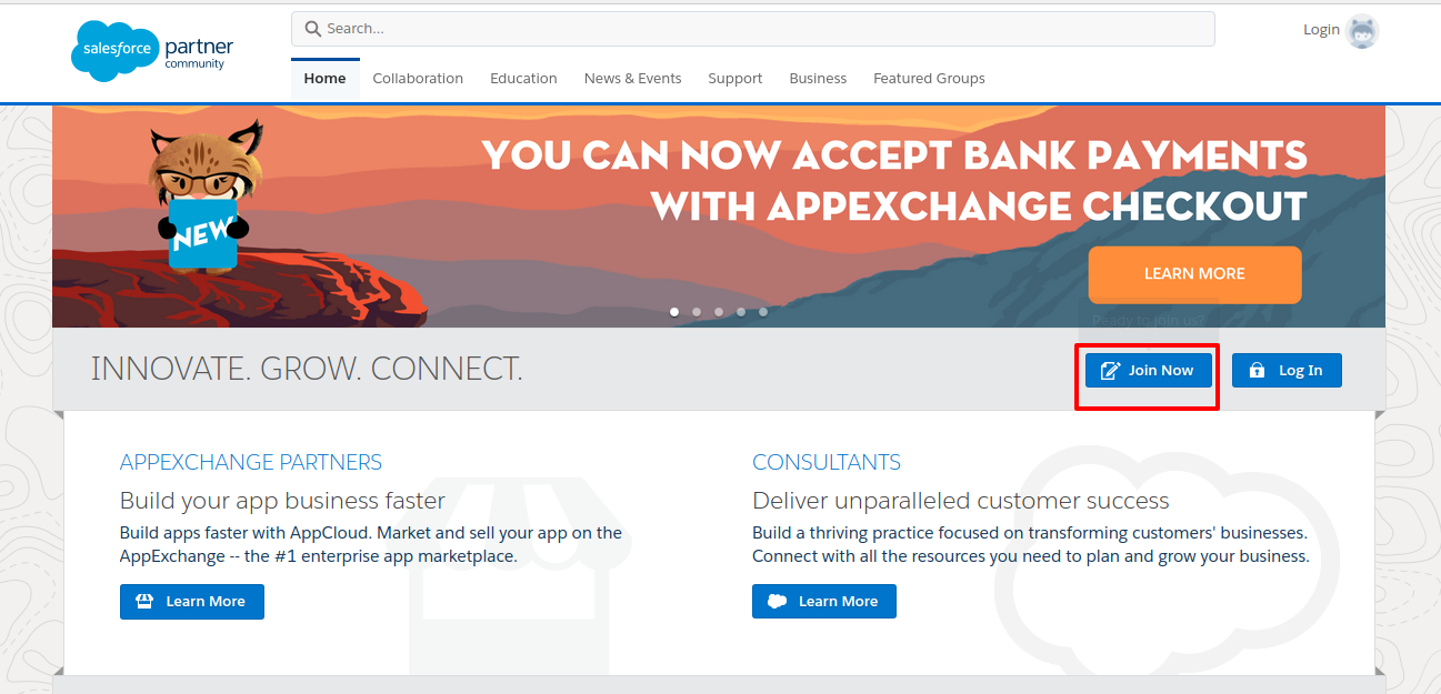 - Go to https://partners.salesforce.com/ and click Join Now.