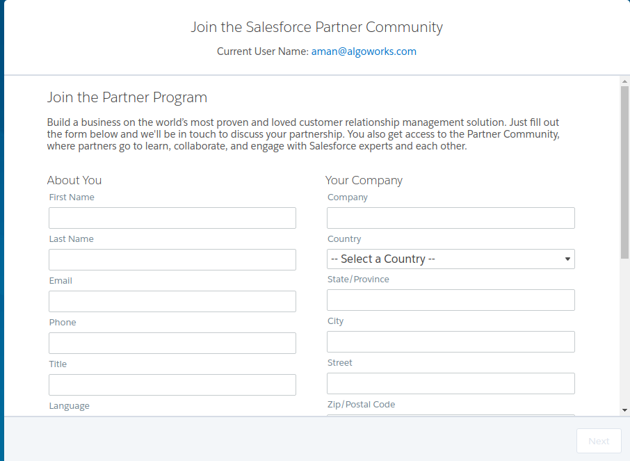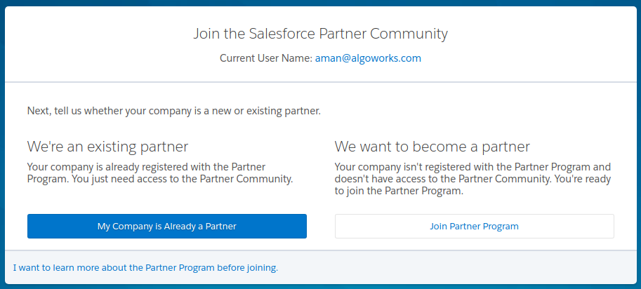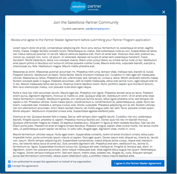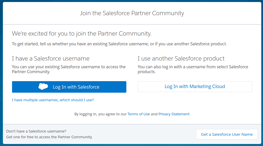 - To create a partner account you can either sign up using your Existing salesforce username or you can use you marketing Cloud credentials.