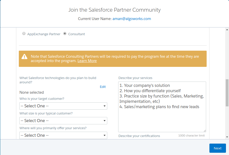 - On the step 5 if you click on 'Join Partner Program' a form will open on the next page. After filling the form click on Next button. Your form will look like below screenshot :