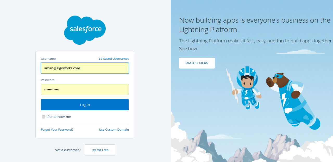 - Once you click on one of above two buttons they asked you to login using your existing credential. For now, we are using our existing Salesforce credentials.
