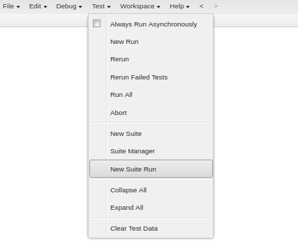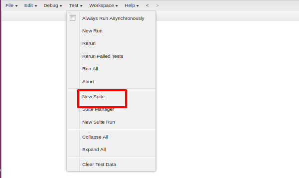 - Open the developer console and select ‘Test’ tab and click on "new suite" from the drop-down.