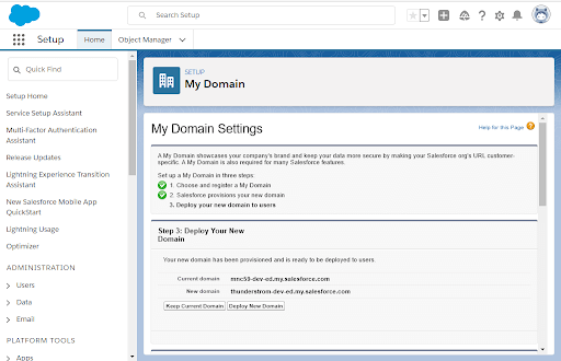 Now finally just click on “Deploy New Domain” and hence your new domain is created. Now you have to login once again into your org.