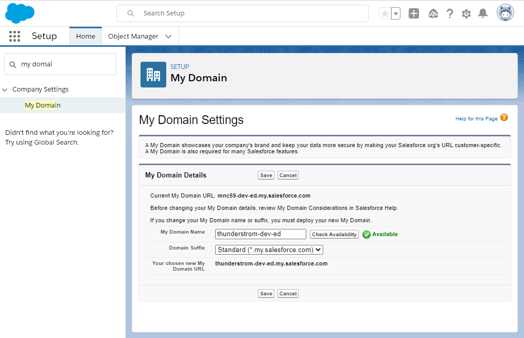 So here I choose “My domain name - thunderstorm-dev-ed “ and according to my domain name Salesforce generates one URL i.e “Your chosen new my domain URL - thunderstrom-dev-ed.my.salesforce.com“.