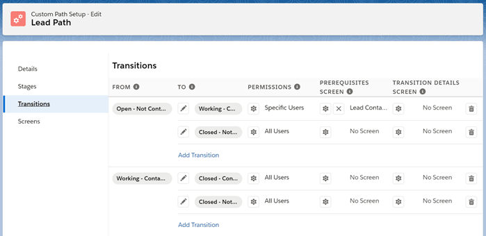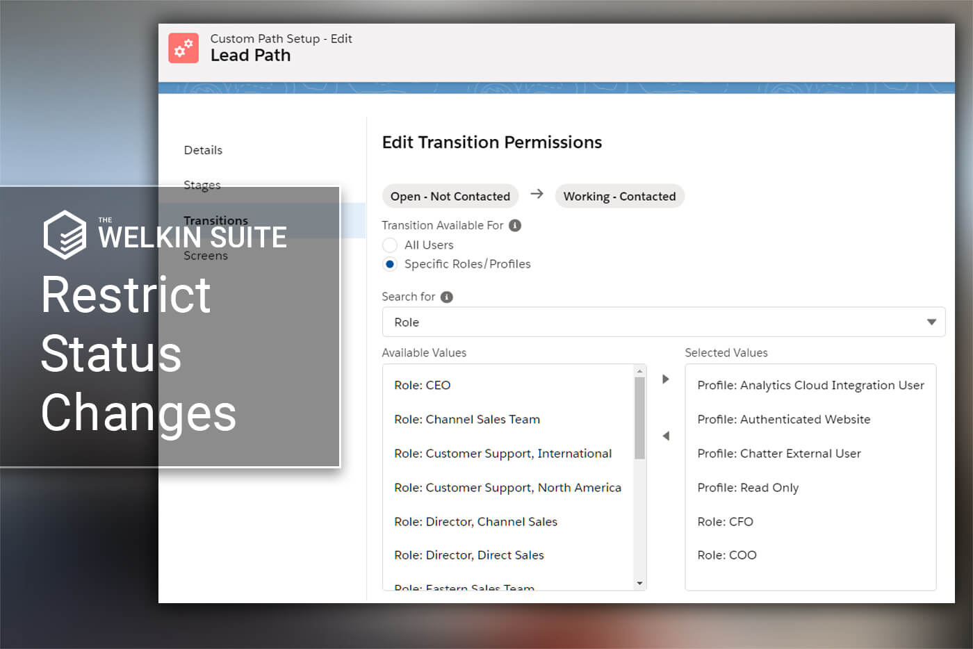 Creating and editing any path in Welkin's Customizable Path, you can separately restrict each transition to certain profiles and/or roles. You just need to open your Path configuration, switch to the Transitions tab, and click on the "Configuration" for transition's permissions. It takes less than a couple of hours to fully configure Welkin's Customizable Path, including proper permissions, whereas doing the same in the "common way" usually takes a couple of days + a lot of future maintenance.