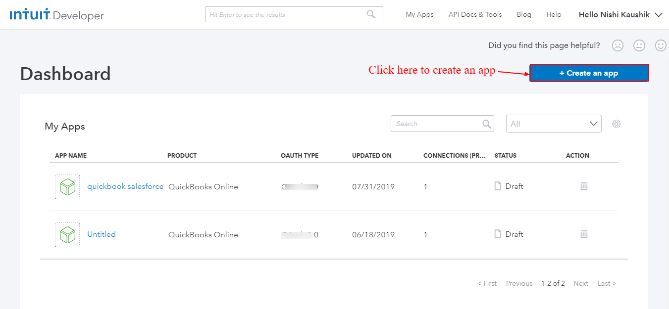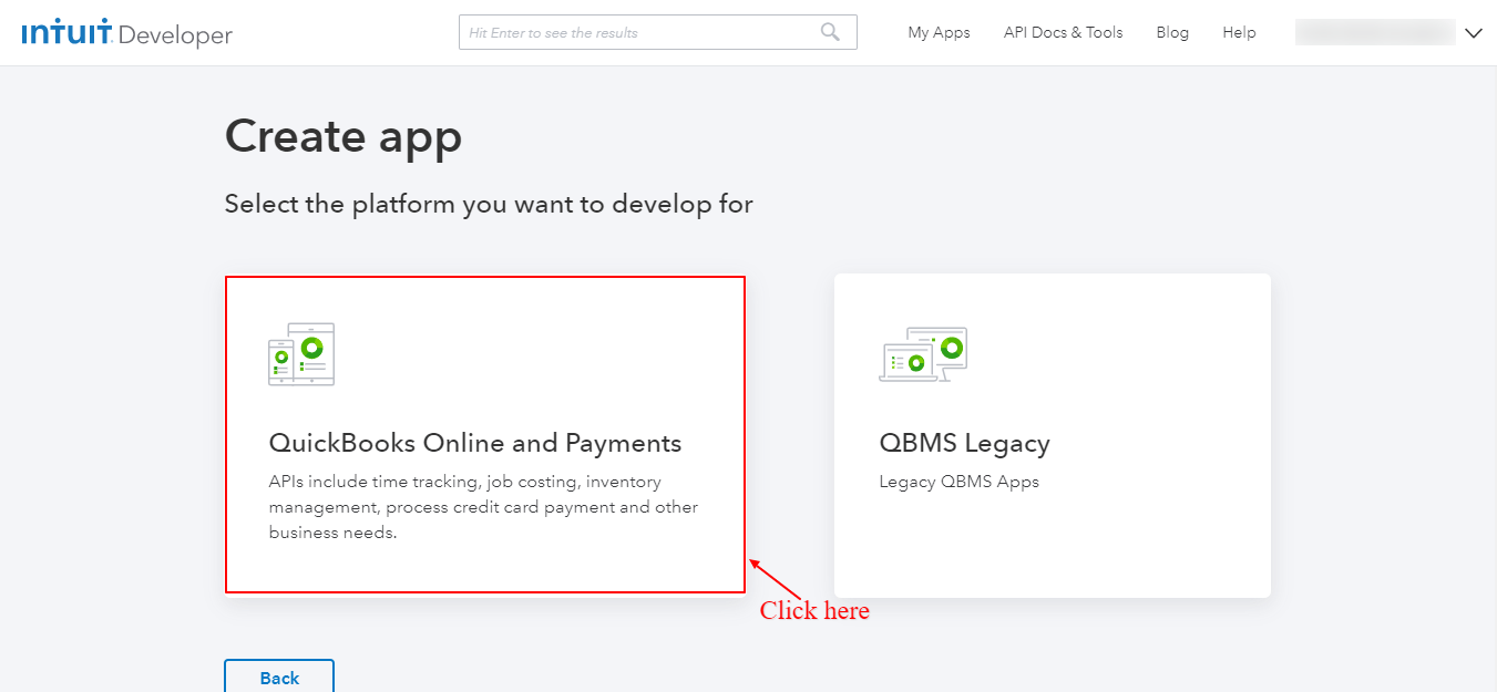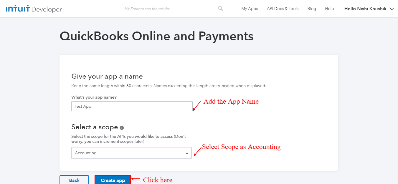 - If you don’t have QuickBooks Application, you can get it from here, Go to My App and: Create a QuickBooks Application