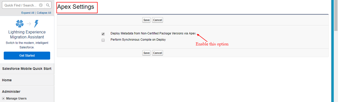 - Go to Setup | c | Enable the Deploy Metadata from Non-Certified Package Versions via Apex