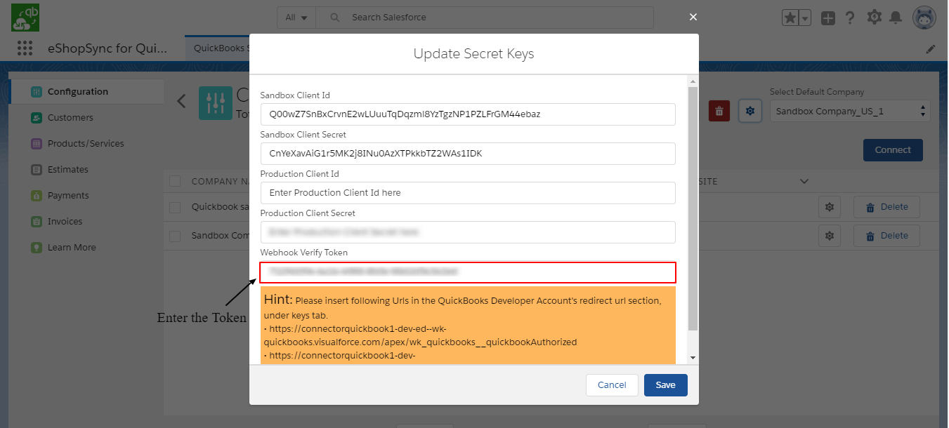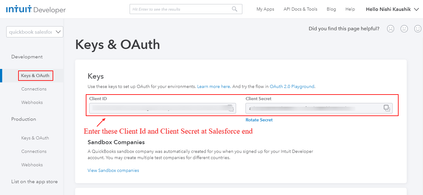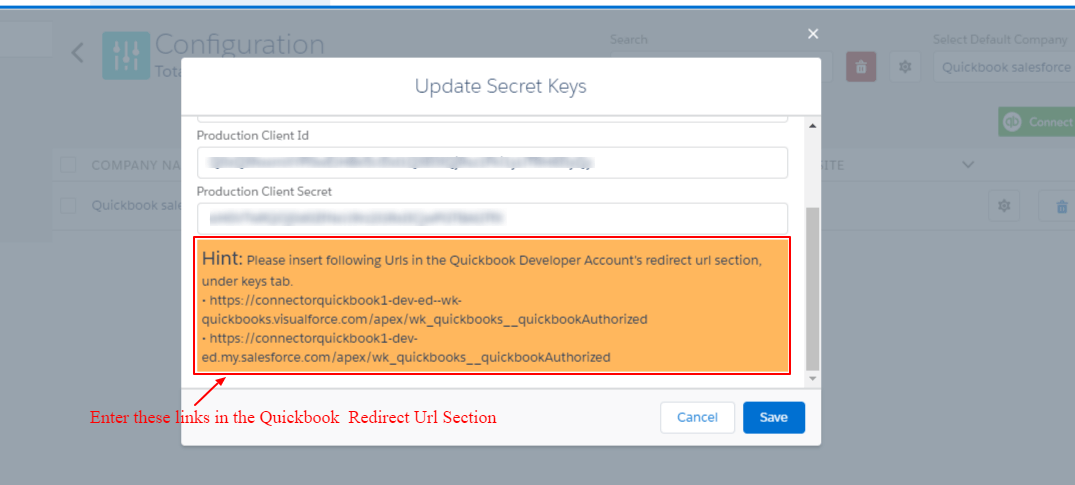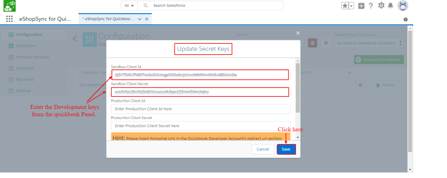 - Enter the Update Client ID & Client Secret from the QuickBooks Development Keys Section.