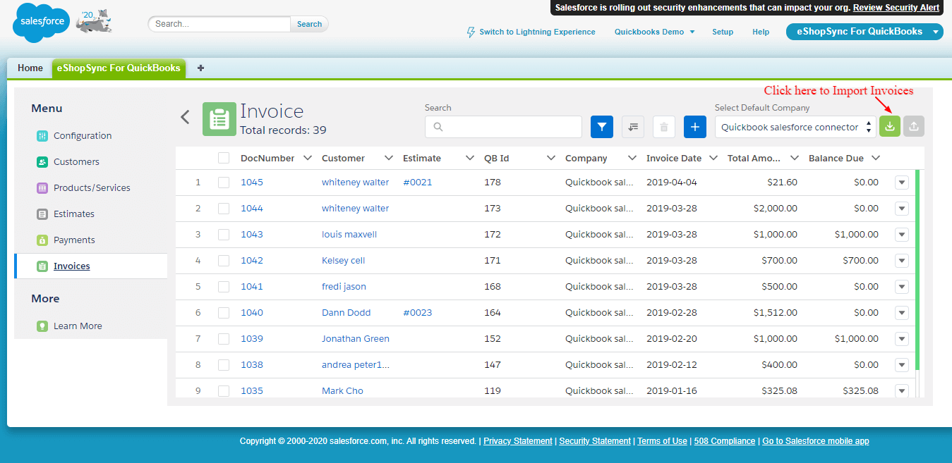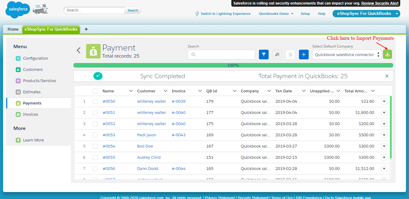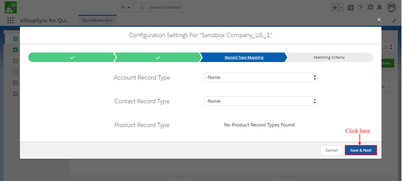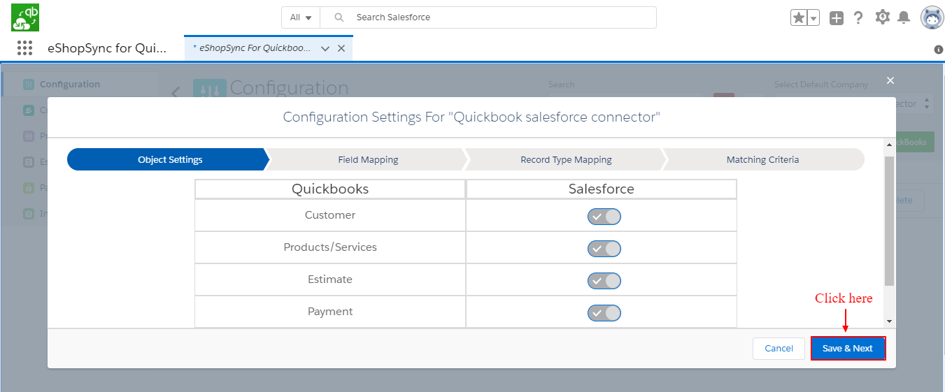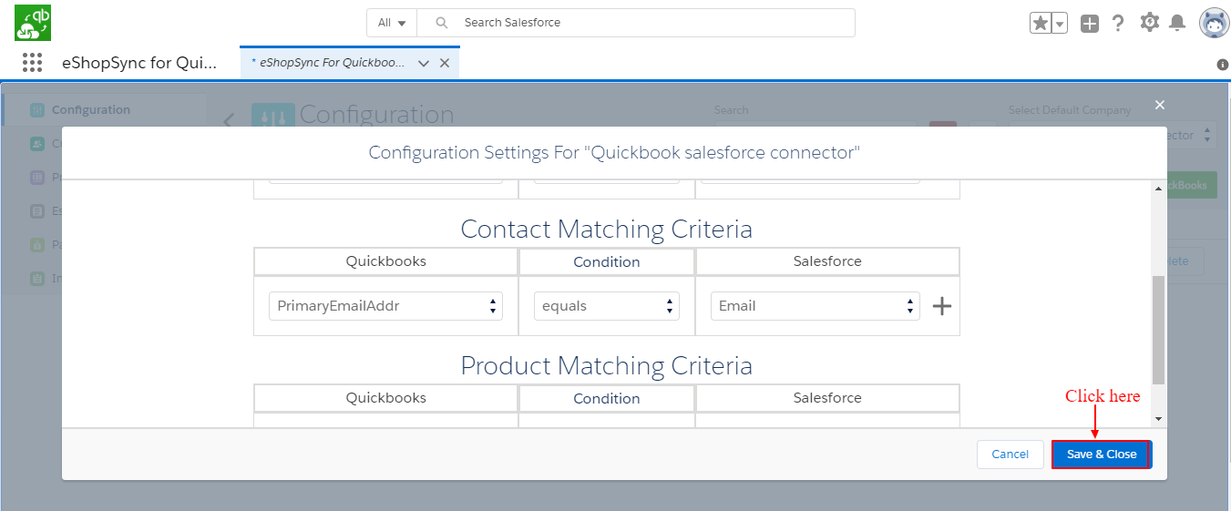 Note: Application required to install in Salesforce Org from AppExchnage: eShopSync for QuickBooks