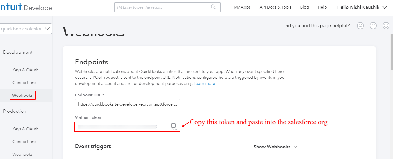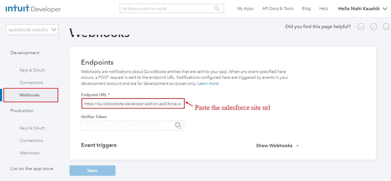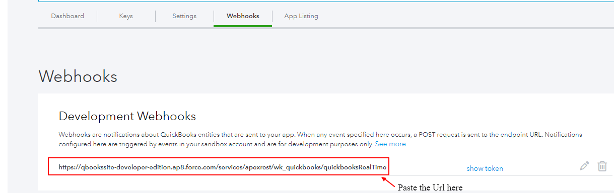 - Paste the Site Url in the Webhook Section of QuickBooks Part.