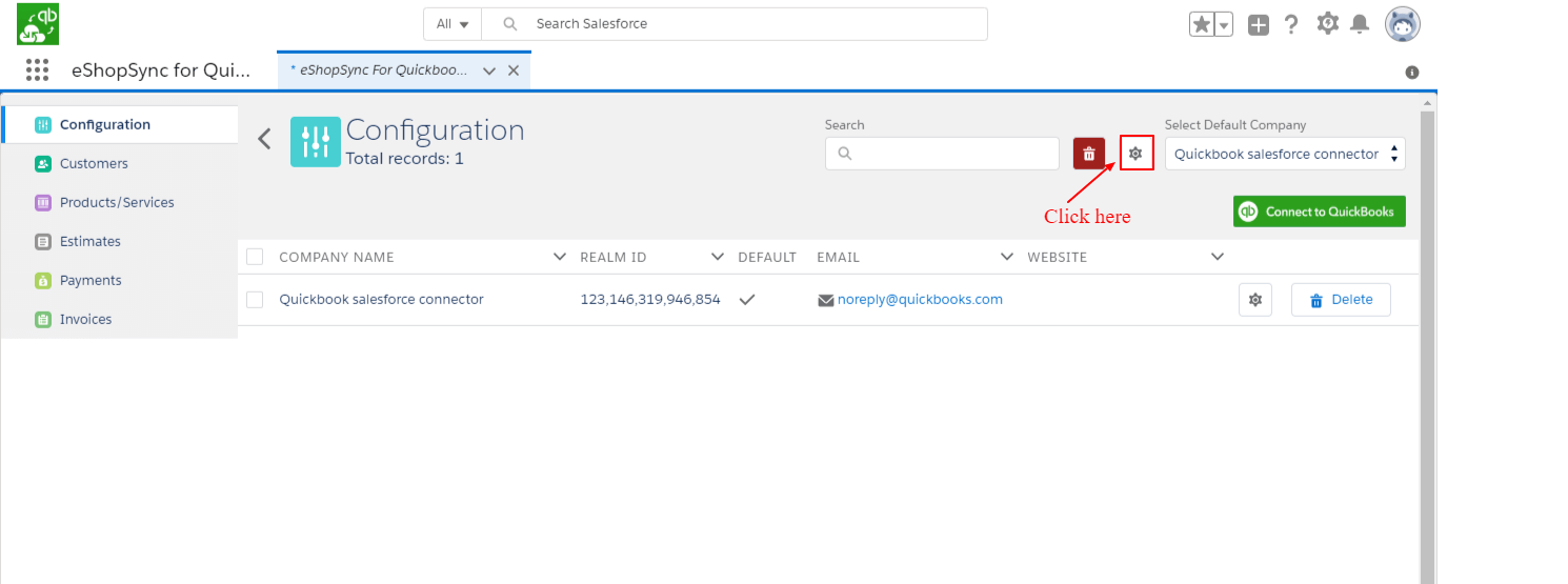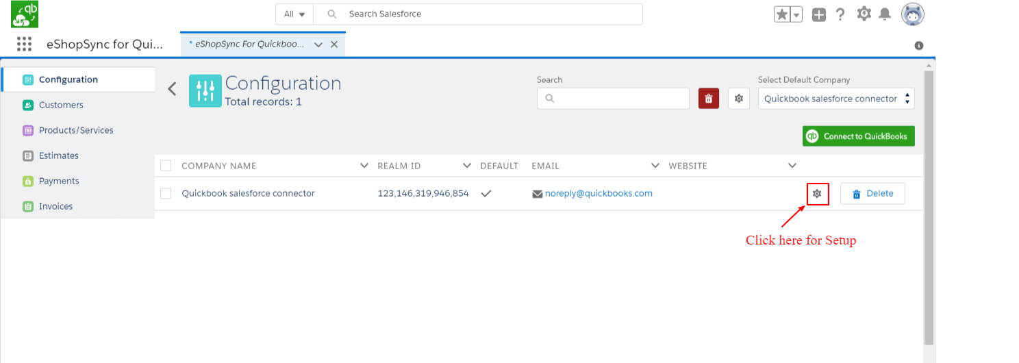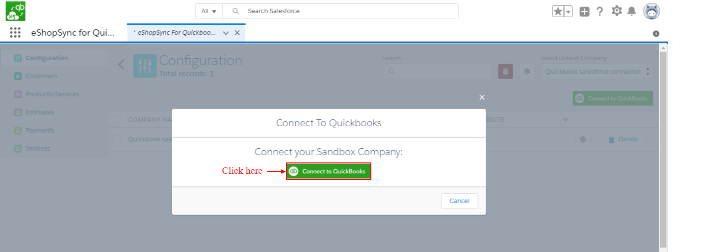 - Click on Connect to QuickBooks to establish the connection between QuickBooks and Salesforce