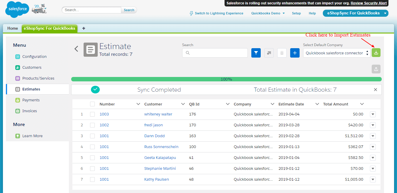 - Sync Estimate: Click on the Import option to start Importing data from QuickBooks as shown below.