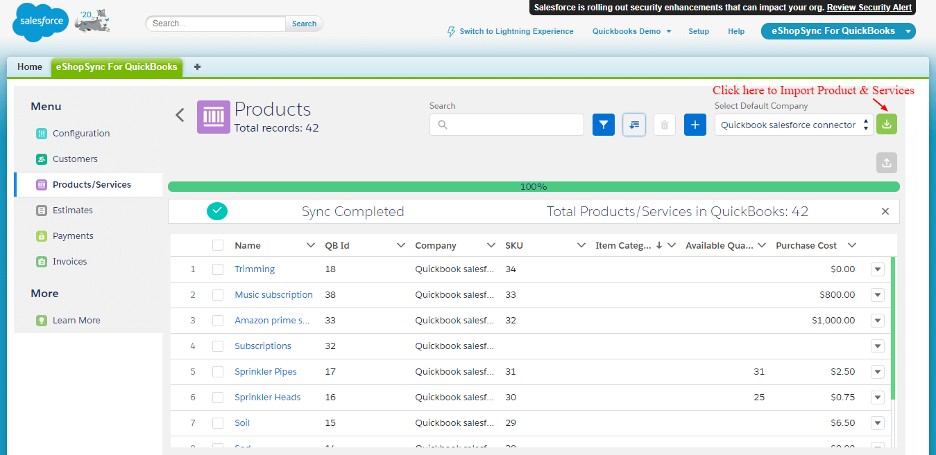 - Sync Product & Services: Click on the Import option to start Importing data from QuickBooks as shown below.