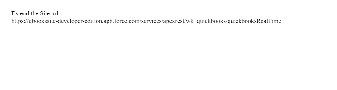 - Append the site Url with https://qbookssite-developer-edition.ap8.force.com/services/apexrest/wk_quickbooks/quickbooksRealTime